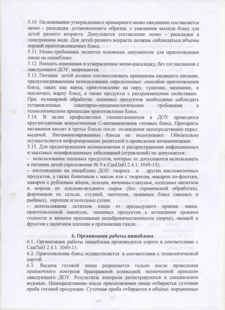 Общий контроль за организацией и качеством питания воспитанников, витаминизацией блюд, закладкой продуктов, кулинарной обработкой, выходом блюд, вкусовыми качествами пищи, санитарным состоянием пищеблока и его оснащением, правильностью хранения, соблюдением сроков реализации продуктов возлагается на администрацию детского сада. Пищеблок оснащен всем необходимым технологическим, холодильным оборудованием. Набор оборудования пищеблока принят в соответствии с нормами СанПиН.