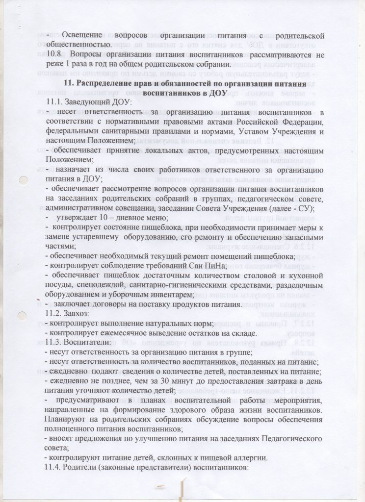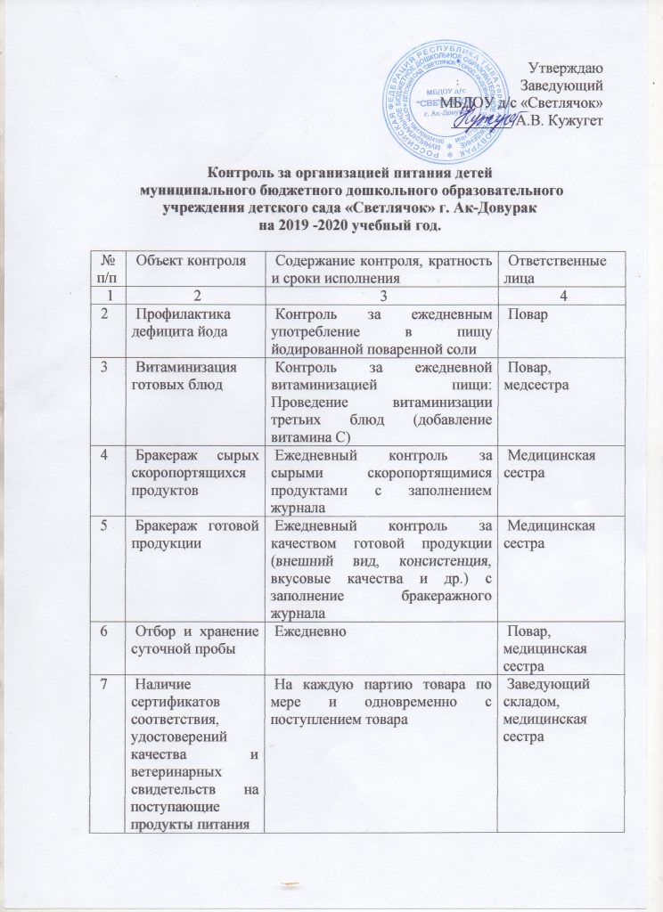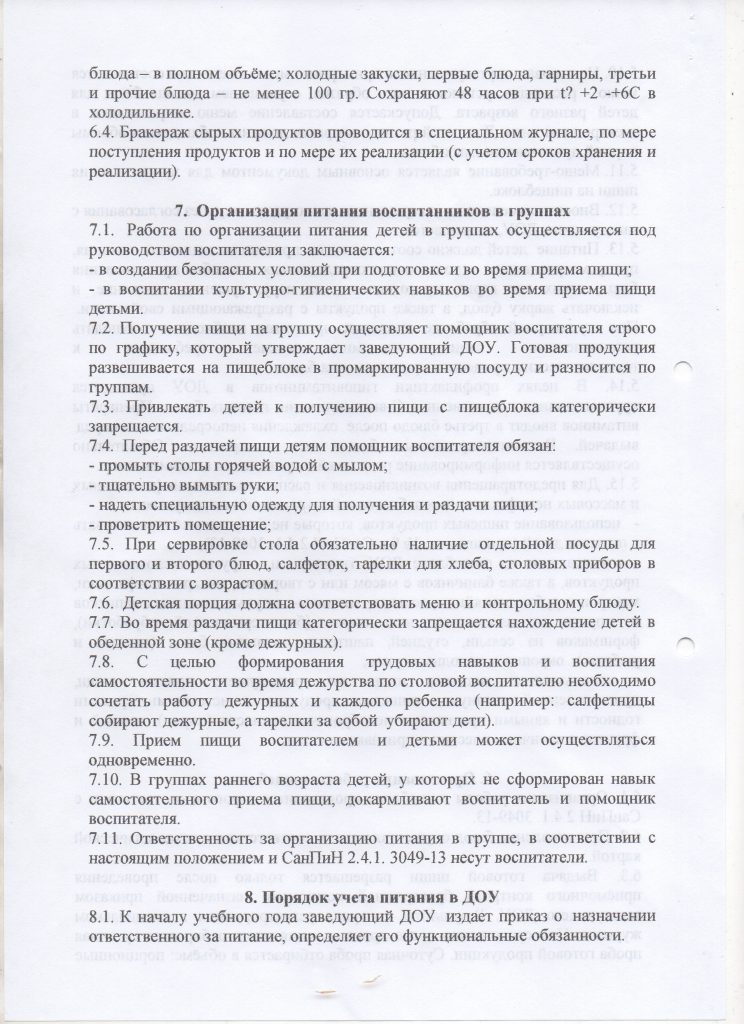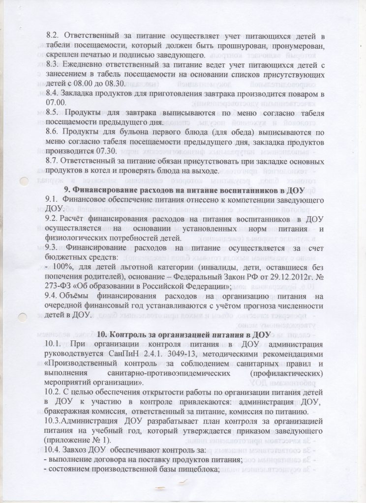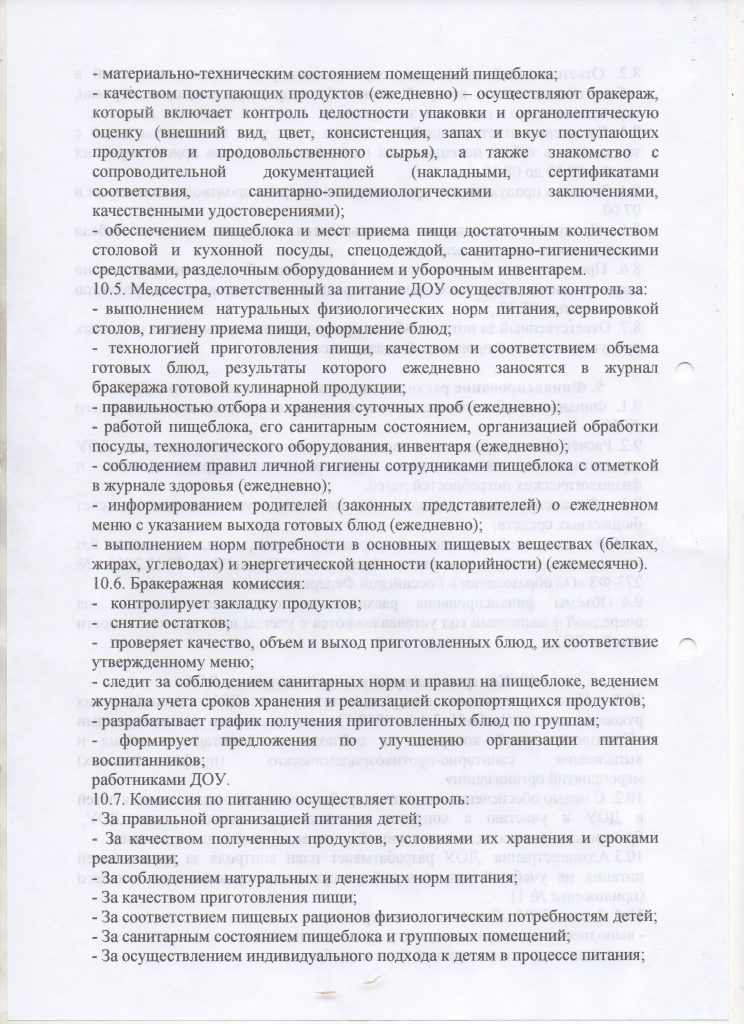 Общий контроль за организацией и качеством питания воспитанников, витаминизацией блюд, закладкой продуктов, кулинарной обработкой, выходом блюд, вкусовыми качествами пищи, санитарным состоянием пищеблока и его оснащением, правильностью хранения, соблюдением сроков реализации продуктов возлагается на администрацию ДОУ.