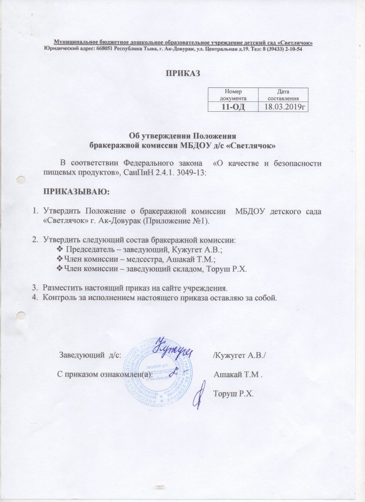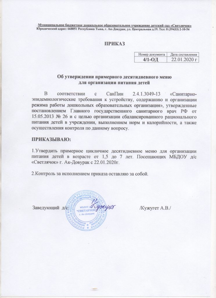 3.Приказ № 50 от 30.09.2024 «О назначении ответственного за организацию питания и питьевой режим обучающихся МБДОУ д/с «Светлячок» г.Ак-Довурак, перечень обязанностей ответственного за организацию питания