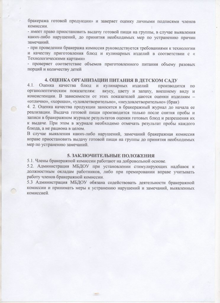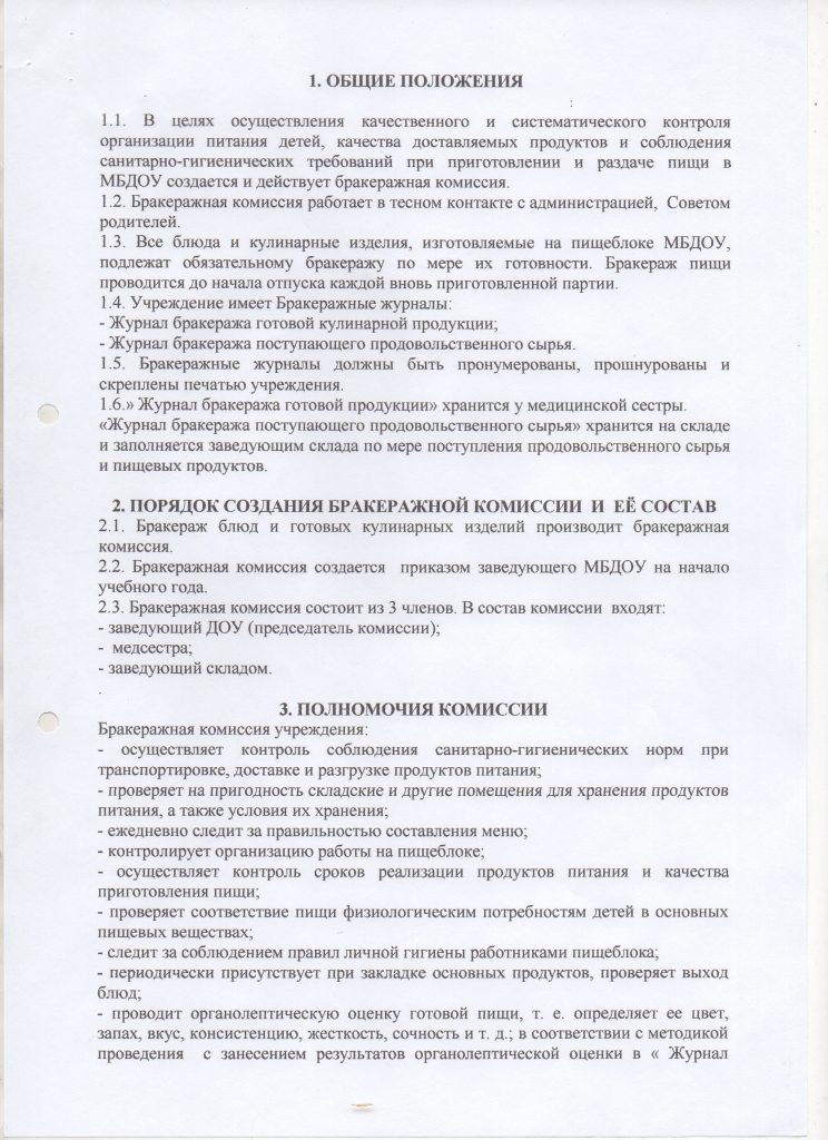 Для осуществления контроля организации питания детей, качества доставляемых продуктов и соблюдения санитарно-гигиенических требований при приготовлении и раздаче пищи в учреждении создана бракеражная комиссия. Выдача готовой пищи разрешается только после проведения контроля бракеражной комиссией в составе не менее 3-х человек. Результаты контроля регистрируются в журнале бракеража готовой кулинарной продукции. В соответствии с графиком бракеражная комиссия и снимает пробу готовых блюд.