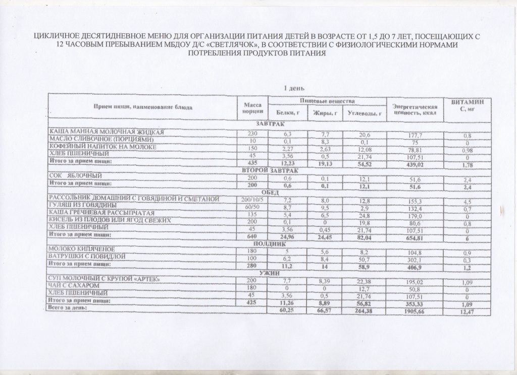 Наш детский сад работает по утвержденному 10-дневному меню, с учетом рекомендуемых среднесуточных норм питания.