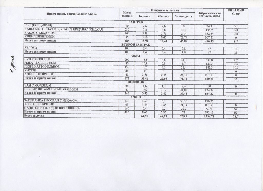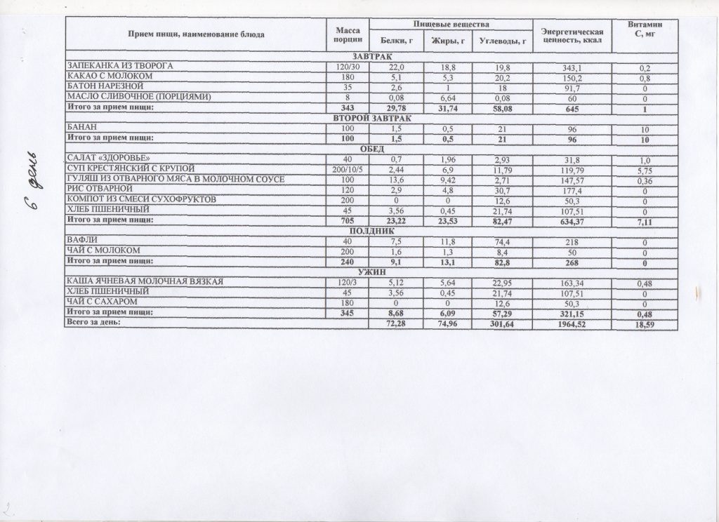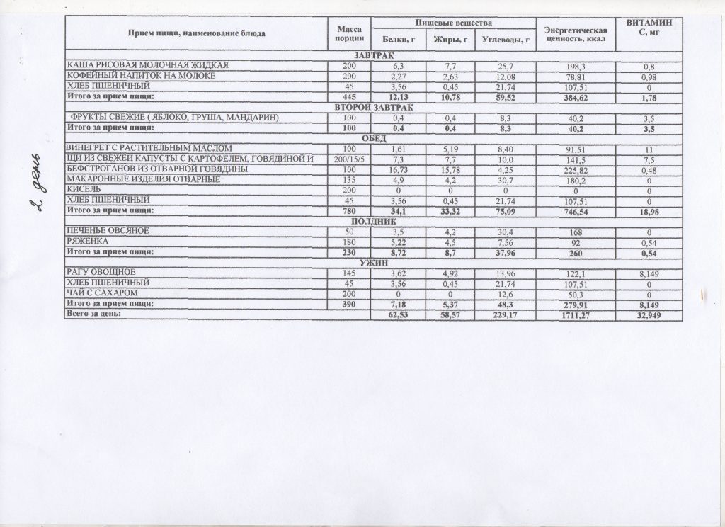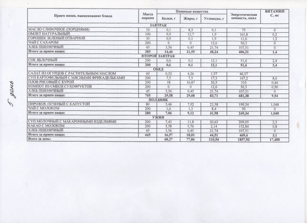 Меню содержит информацию о количественном составе основных пищевых веществ и энергии (белков, жиров, углеводов) по каждому блюду, приему пищи, за каждый день и в целом за период его реализации