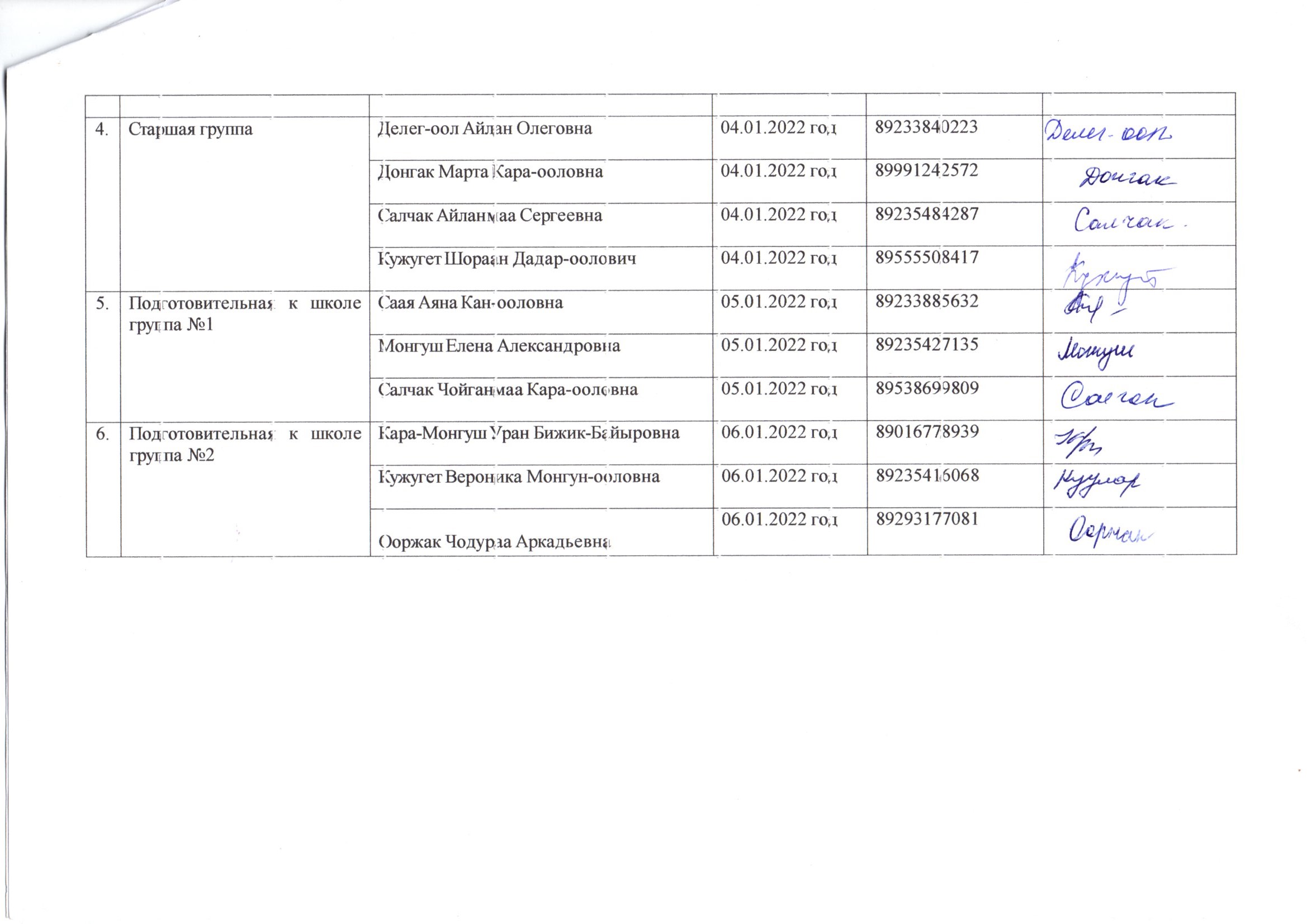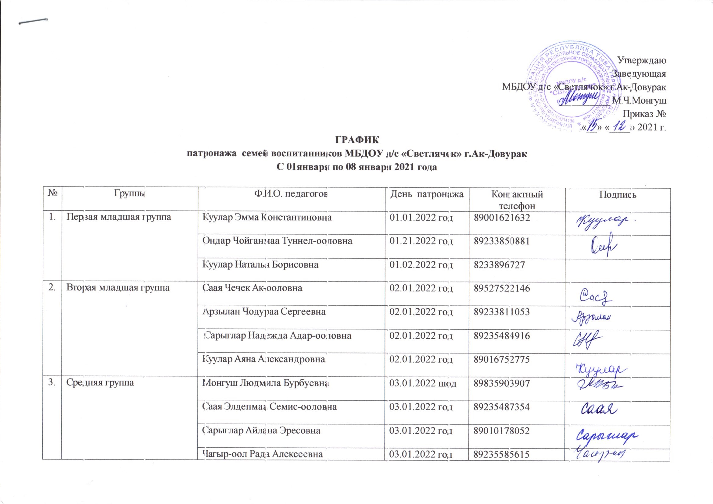 График патронажа семей воспитанников МБДОУ д/с «Светлячок» в новогодние каникулы с 01 по 08 января 2022 года